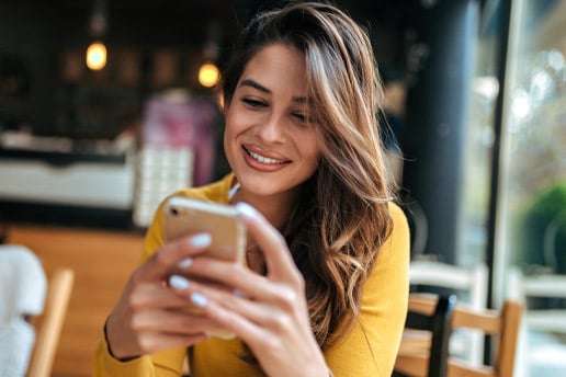 Man sitting outside coffee shop holding a cup of coffee and looking at his phone